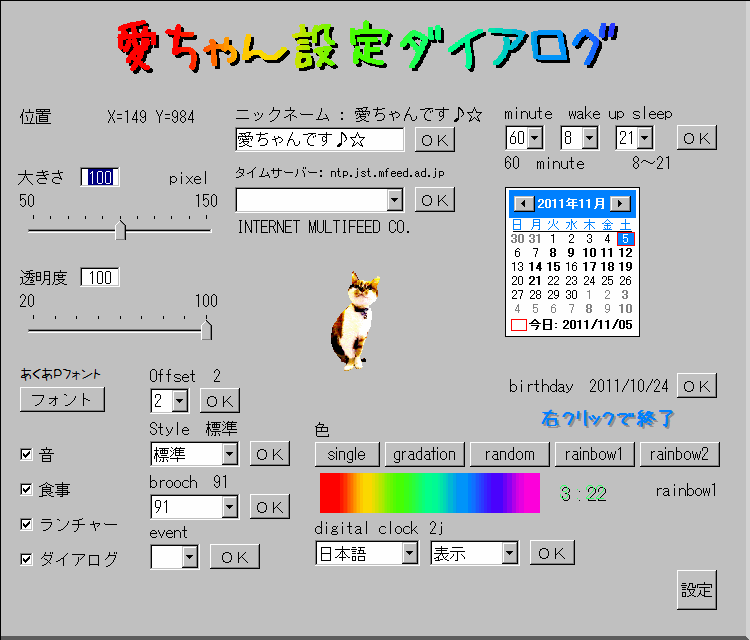 [wake up] : 愛ちゃんが時間になったら起きます。24時間制で0〜23迄指定出来ます。